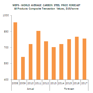 London, 15 October 2013 MEPS forecasts a recovery in its global steel price over the next three years. In the company's latest long term forecast, it predicts that 2013 will be the low point in this cycle. Consumption should begin to pick up in 2014 as the economic climate improves. Nevertheless, there are a number of difficulties to overcome. Government spending restrictions in western nations are expected to continue to limit infrastructure and construction activity. Furthermore, concerns are developing over a slowdown in Chinese demand. Moreover, buyers across the world are likely to remain cautious about rebuilding inventories. However, we do expect some degree of restocking next year. Consequently, the average steel price in 2014 is forecast to be above the year earlier figure. A reduction in iron ore costs is anticipated over the medium term. This could limit the prospects for steel price rises. Nevertheless, domestic mills will, almost certainly, attempt to push through advances in selling figures in a bid to recover profitability as demand levels grow. MEPS, therefore, envisages an uptrend in average annual steel transaction values through to 2016. Ends -- Source: MEPS - Steel Price Forecasts to 2017 |